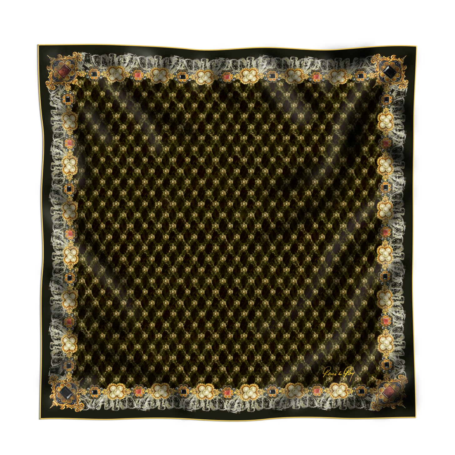 Pomona — The Harvest After Sorrow. Born from the stillness of Midnight, Pomona gathers what remains — the sweetness that grief could not take. The pomegranates no longer bleed; they glisten, ripe and full, their seeds now symbols of survival, not ache. Grapes and blossoms weave through the dark like hope reclaiming its color. This scarf is the after — where pain softens into remembrance, and the heart, though scarred, learns again to bear fruit.